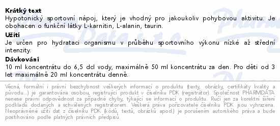 Hypotonický sportovní nápoj, který je vhodný pro jakoukoliv pohybovou aktivitu. Je obohacen o funkční látky L-karnitin, L-alanin, taurin.