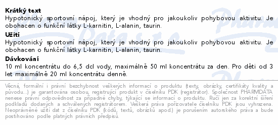 Hypotonický sportovní nápoj, který je vhodný pro jakoukoliv pohybovou aktivitu. Je obohacen o funkční látky L-karnitin, L-alanin, taurin.