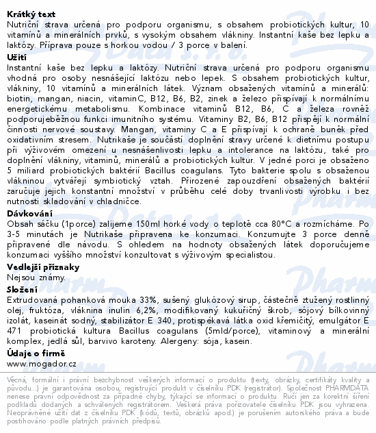 Nutriční strava určená pro podporu organismu, s obsahem probiotických kultur, 10 vitamínů a minerálních prvků, s vysokým obsahem vlákniny. Instantní kaše bez lepku a laktózy. Příprava pouze s horkou vodou / 3 porce v balení.