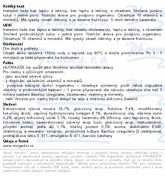 Instantní kaše bez lepku a laktózy, bez lepku a laktózy, s obsahem 5miliard probio kutur v jedné porci. Nutriční strava pro podporu organismu. Obsahuje 10 vitamínů a minerálů. Má vysoký obsah vlákniny a je slazena fruktózou. S chutí slaného karamelu.
