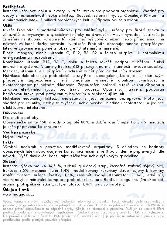 Instantní kaše bez lepku a laktózy. Nutriční strava pro podporu organismu. Vhodná pro osoby s nesnášenlivostí lepku a laktózy. Součást racionální výživy. Obsahuje 10 vitaminů a minerálních látek, 5 miliard probiotických kultur. Příprava pouze s vodou.