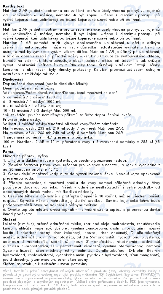 Nutrilon 2 AR je dietní potravina pro zvláštní lékařské účely vhodná pro výživu kojenců od ukončeného 6. měsíce, nemohou-li být kojeni. Určeno k dietnímu postupu při výživě kojenců, kteří ublinkávají po běžné kojenecké stravě nebo při odříhnutí.