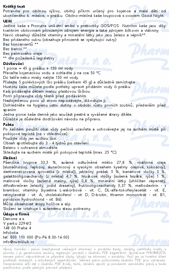 Potravina pro obilnou výživu, obilný příkrm určený pro kojence a malé děti od ukončeného 6. měsíce, v prášku. Obilno-mléčná kaše krupicová s ovocem Good Night.