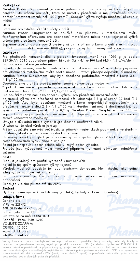Nutrilon Protein Supplement je dietní potravina vhodná pro výživu kojenců již od narození. Je určena pro děti, které se narodily předčasně a mají extrémně nízkou porodní hmotnost (menší než 1000 gramů). Speciální výživa zvyšuje množství bílkovin v mléce.