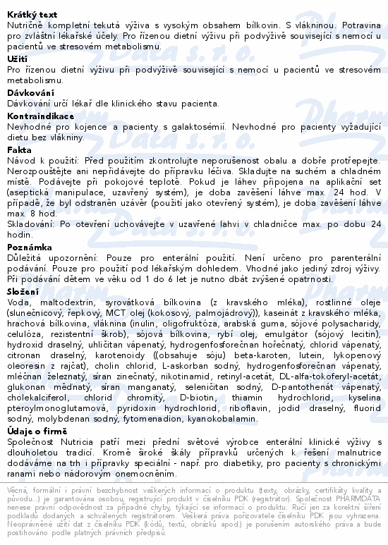 Nutričně kompletní tekutá výživa s vysokým obsahem bílkovin. S vlákninou. Potravina pro zvláštní lékařské účely. Pro řízenou dietní výživu při podvýživě související s nemocí u pacientů ve stresovém metabolismu.