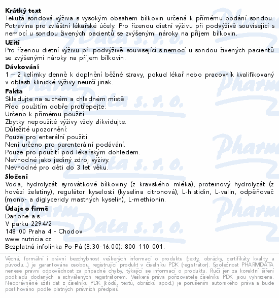Tekutá sondová výživa s vysokým obsahem bílkovin určená k přímému podání sondou. Potravina pro zvláštní lékařské účely. Pro řízenou dietní výživu při podvýživě související s nemocí u sondou živených pacientů se zvýšenými nároky na příjem bílkovin.