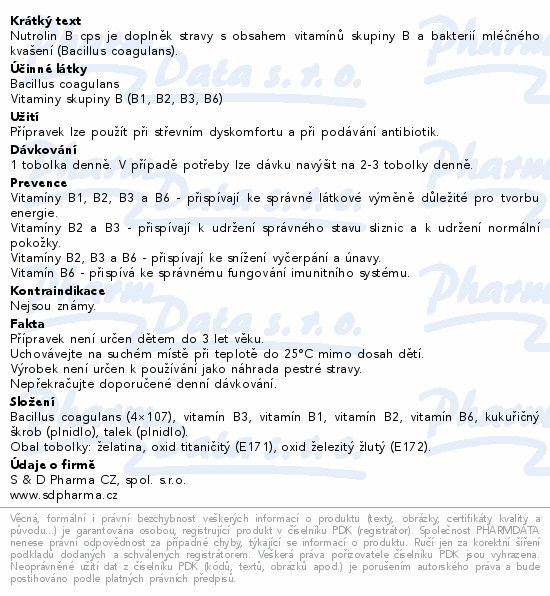 Nutrolin B cps je doplněk stravy s obsahem vitamínů skupiny B a bakterií mléčného kvašení (Bacillus coagulans).