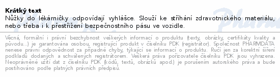 Nůžky do lékárničky odpovídají vyhlášce. Slouží ke stříhání zdravotnického materiálu, nebo třeba i k přestřižení bezpečnostního pásu ve vozidle.