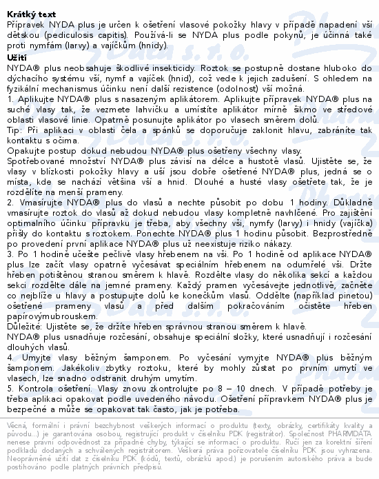 Přípravek NYDA plus je určen k ošetření vlasové pokožky hlavy v případě napadení vší dětskou (pediculosis capitis). Používá-li se NYDA plus podle pokynů, je účinná také proti nymfám (larvy) a vajíčkům (hnidy).