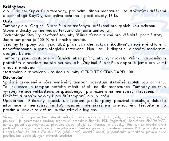 o.b. Original Super Plus tampony, pro velmi silnou menstruaci, se stočenými drážkami a technologií StayDry, spolehlivá ochrana a pocit čistoty 16 ks.