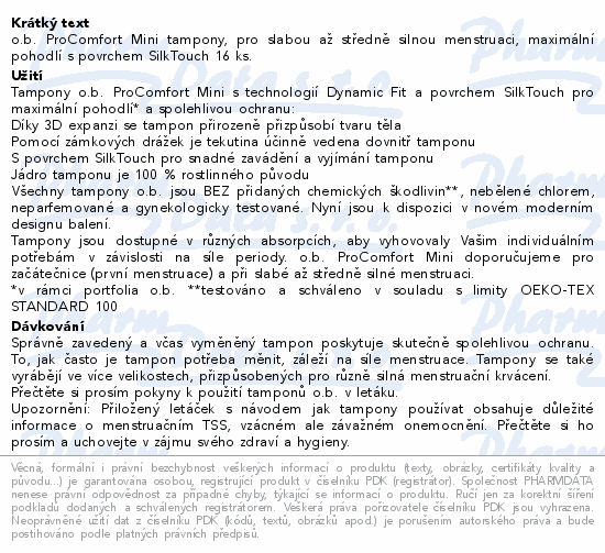 o.b. ProComfort Mini tampony, pro slabou až středně silnou menstruaci, maximální pohodlí s povrchem SilkTouch 16 ks.