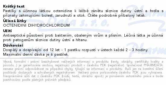 | Farmako-terapeutická skupina, účinné látky: | RESPIRAČNÍ SYSTÉM -> KRČNÍ LÉČIVA -> KRČNÍ LÉČIVA -> ANTISEPTIKA -> OKTENIDIN |