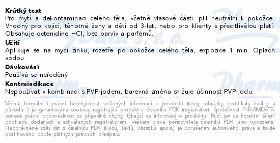 Pro mytí a dekontaminaci celého těla, včetně vlasové části. pH neutrální k pokožce. Vhodný pro kojící, těhotné ženy a děti od 3-let, nebo pro klienty s přecitlivělou pletí. Obsahuje octenidine HCl, bez barviv a parfémů.