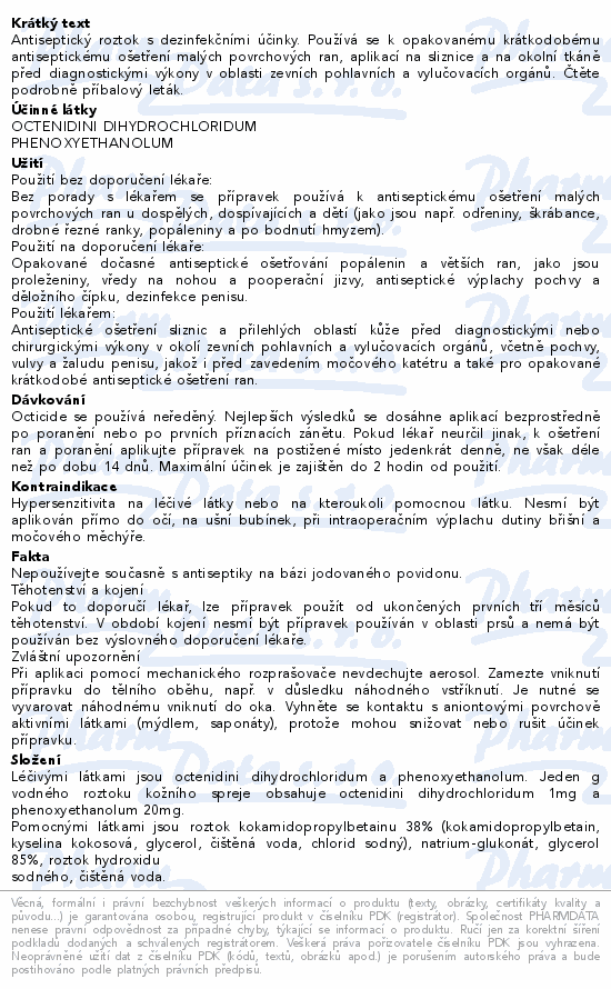 Bezbarvý antiseptický roztok s dezinfekčními účinky, který nepálí. Vhodný k ošetření povrchových ran, kůže a sliznic. Ničí bakterie a plísně, které mohou zkomplikovat hojení v ráně. Čtěte pozorně příbalový leták.