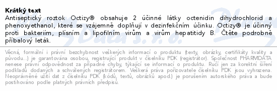 Antiseptický roztok Octizy® obsahuje 2 účinné látky octenidin dihydrochlorid a phenoxyethanol, které se vzájemně doplňují v dezinfekčním účinku. Octizy® je účinný proti bakteriím, plísním a lipofilním virům a virům hepatitidy B. Čtěte pozorně příbalový leták.