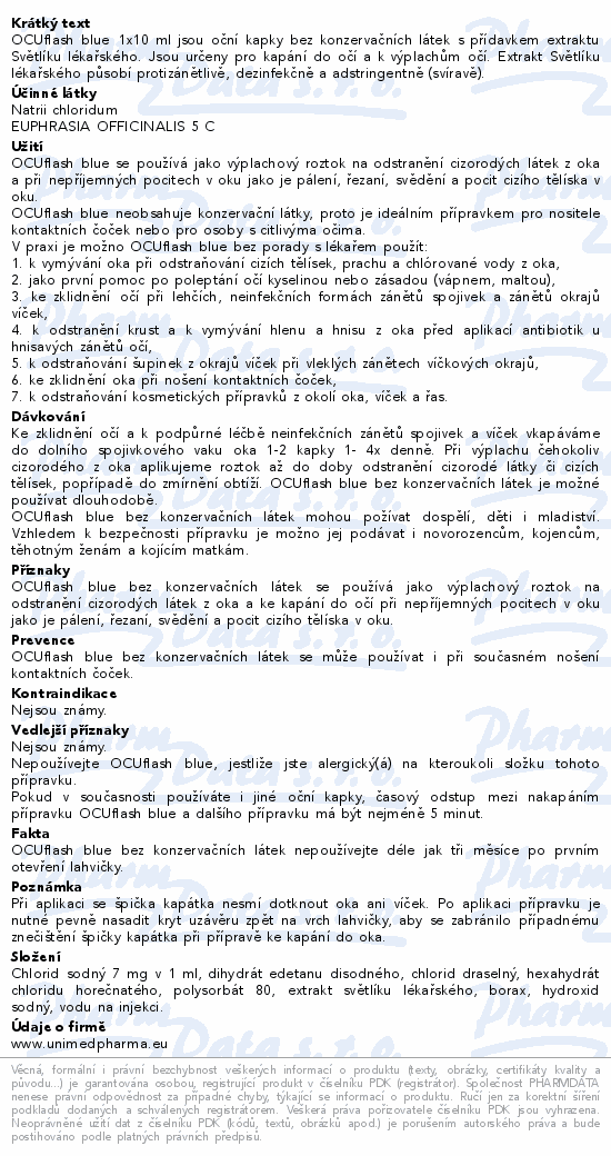 OCUflash blue 1x10 ml jsou oční kapky bez konzervačních látek s přídavkem extraktu Světlíku lékařského. Jsou určeny pro kapání do očí a k výplachům očí. Extrakt Světlíku lékařského působí protizánětlivě, dezinfekčně a adstringentně (svíravě).