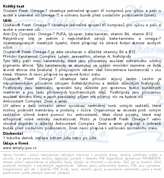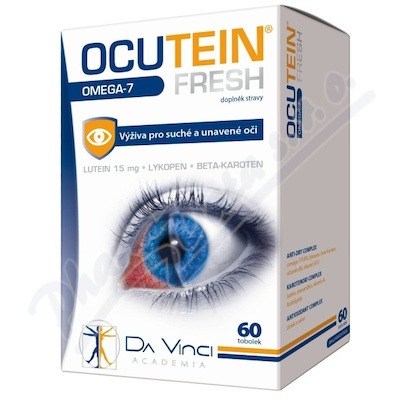 Ocutein Fresh Omega-7 obsahuje jedinečné spojení tří komplexů pro výživu a péči o suché a unavené oči (omega-7) a ochranu buněk před oxidačním poškozením (zinek).