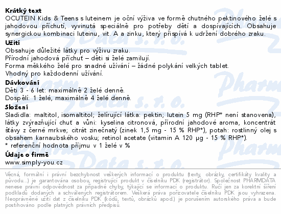 OCUTEIN Kids & Teens s luteinem je oční výživa ve formě chutného pektinového želé s jahodovou příchutí, vyvinutá speciálně pro potřeby dětí a dospívajících. Obsahuje synergickou kombinaci luteinu, vit. A a zinku, který přispívá k udržení dobrého zraku.