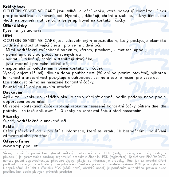 OCUTEIN SENSITIVE CARE jsou zvlhčující oční kapky, které poskytují okamžitou úlevu pro podrážděné a unavené oči. Hydratují, zklidňují, chrání a stabilizují slzný film. Jsou vhodné i pro velmi citlivé oči a lze je aplikovat na kontaktní čočky.