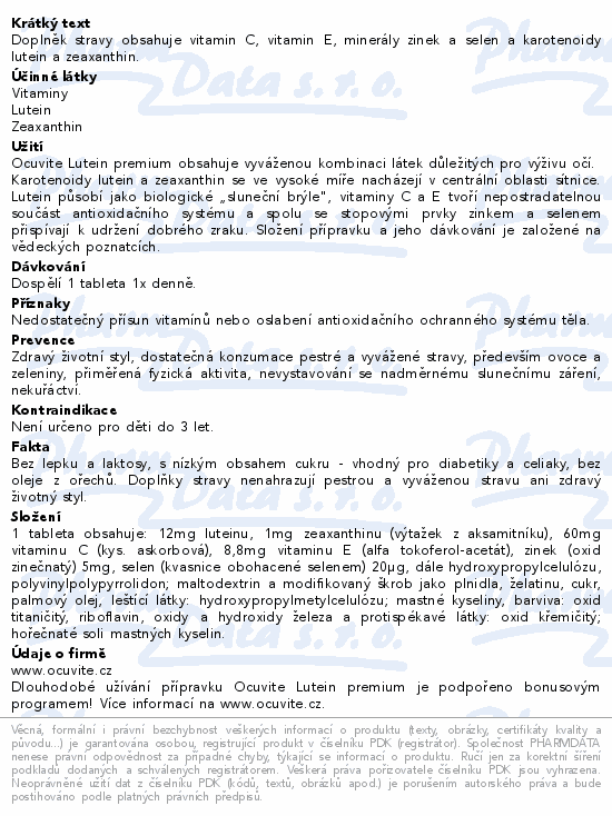 Doplněk stravy obsahuje vitamin C, vitamin E, minerály zinek a selen a karotenoidy lutein a zeaxanthin.