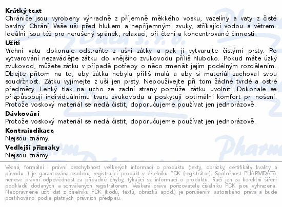 Chrániče jsou vyrobeny výhradně z příjemně měkkého vosku, vazelíny a vaty z čisté bavlny. Chrání Vaše uši před hlukem a nepříjemnými zvuky, stříkající vodou a větrem. Ideální jsou též pro nerušený spánek, relaxaci, při čtení a koncentrované činnosti.