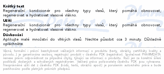 Regenerační kondicionér pro všechny typy vlasů, který pomáhá obnovovat, regenerovat a hydratovat vlasové vlákno.