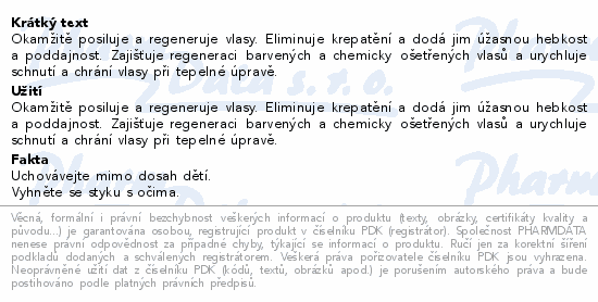 Okamžitě posiluje a regeneruje vlasy. Eliminuje krepatění a dodá jim úžasnou hebkost a poddajnost. Zajišťuje regeneraci barvených a chemicky ošetřených vlasů a urychluje schnutí a chrání vlasy při tepelné úpravě.