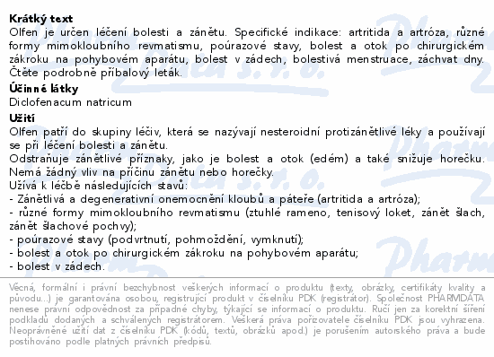 Olfen je určen léčení bolesti a zánětu. Specifické indikace: artritida a artróza, různé formy mimokloubního revmatismu, poúrazové stavy, bolest a otok po chirurgickém zákroku na pohybovém aparátu, bolest v zádech, bolestivá menstruace, záchvat dny. Čtěte pozorně příbalový leták.