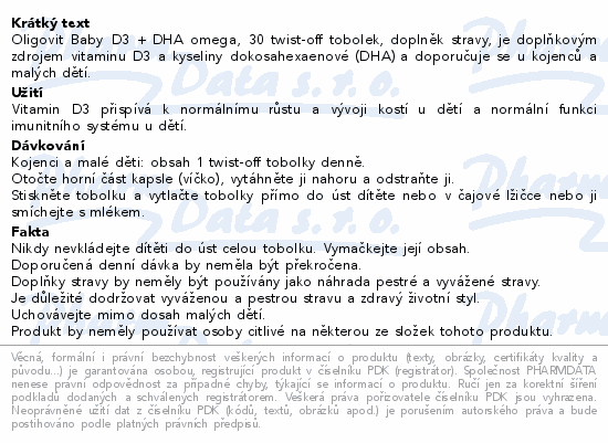 Oligovit Baby D3 + DHA omega, 30 twist-off tobolek, doplněk stravy, je doplňkovým zdrojem vitaminu D3 a kyseliny dokosahexaenové (DHA) a doporučuje se u kojenců a malých dětí.