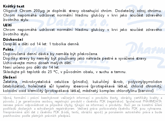 Oligovit Chrom 200µg je doplněk stravy obsahující chróm. Dodatečný zdroj chrómu. Chrom napomáhá udržovat normální hladinu glukózy v krvi jako součást zdravého životního stylu.