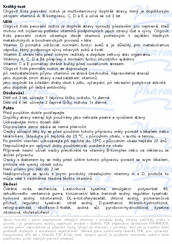 Oligovit Kids perorální roztok je multivitaminový doplněk stravy, který je doplňkovým zdrojem vitaminů A, B komplexu, C, D a E a užívá se od 3 let.