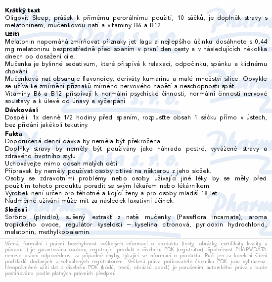 Oligovit Sleep, prášek k přímému perorálnímu použití, 10 sáčků, je doplněk stravy s melatoninem, mučenkovou natí a vitaminy B6 a B12.
