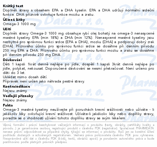 Doplněk stravy s obsahem EPA a DHA kyselin. EPA a DHA udržují normální srdeční funkce. DHA příznivě ovlivňuje funkce mozku a zraku.