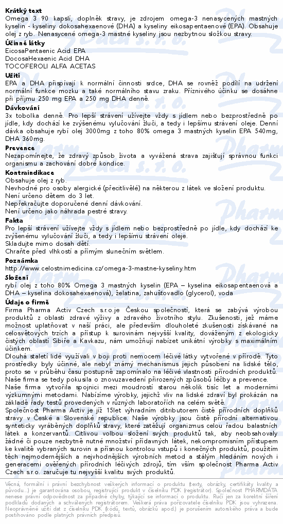 Omega 3 90 kapslí, doplněk stravy, je zdrojem omega-3 nenasycených mastných kyselin - kyseliny dokosahexaenové (DHA) a kyseliny eikosapentaenové (EPA). Obsahuje olej z ryb. Nenasycené omega-3 mastné kyseliny jsou nezbytnou složkou stravy.