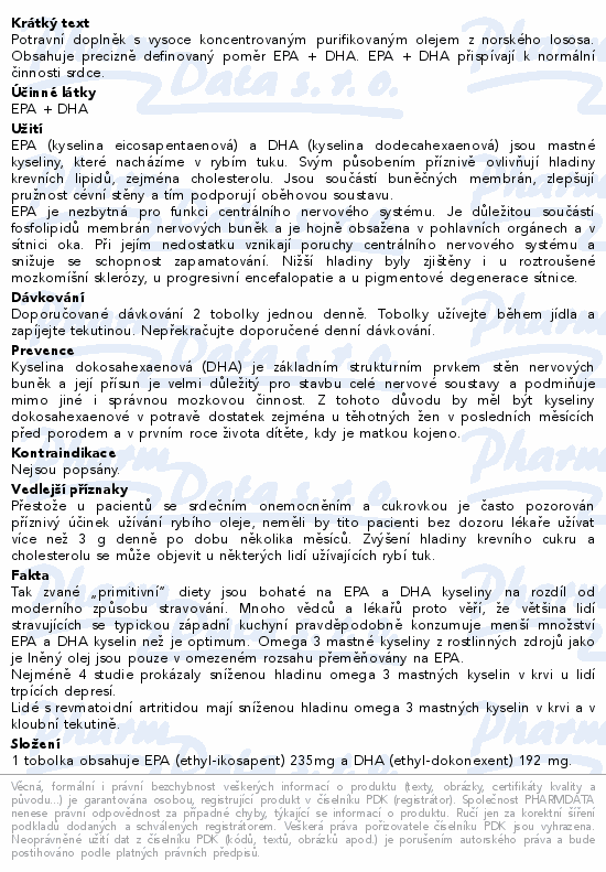 Potravní doplněk s vysoce koncentrovaným purifikovaným olejem z norského lososa. Obsahuje precizně definovaný poměr EPA + DHA. EPA + DHA přispívají k normální činnosti srdce.