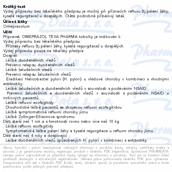 Bez porady s lékařem se přípravek OMEPRAZOL TEVA PHARMA používá u dospělých ke krátkodobé léčbě příznaků refluxu (např. pálení žáhy, kyselá regurgitace).