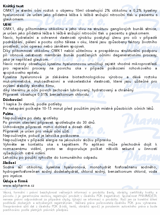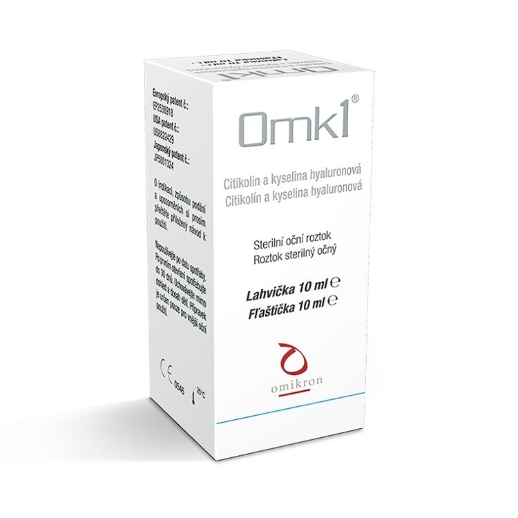 OMK1 je sterilní oční roztok o objemu 10ml obsahující 2% citikolinu a 0,2% kyseliny hyaluronové. Je určen jako přídatná léčba k léčbě snižující nitrooční tlak u pacientu s glaukomem.