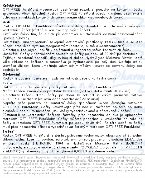 OPTI-FREE PureMoist víceúčelový dezinfekční roztok a pouzdro na kontaktní čočky společnosti Alcon (ploché). Roztok OPTI-FREE PureMoist působí k čištění, dezinfekci a uchovávání měkkých kontaktních čoček (včetně silikon-hydrogelových čoček).