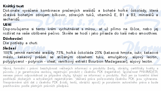 Dokonale vyvážená kombinace pražených arašídů a bohaté hořké čokolády, která zůstává bohatým zdrojem bílkovin, zdravých tuků, vitamínů E, B1 a B3, minerálů a sacharidů.
