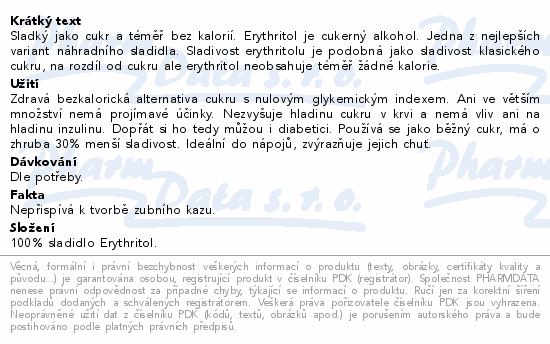 Sladký jako cukr a téměř bez kalorií. Erythritol je cukerný alkohol. Jedna z nejlepších variant náhradního sladidla. Sladivost erythritolu je podobná jako sladivost klasického cukru, na rozdíl od cukru ale erythritol neobsahuje téměř žádné kalorie.