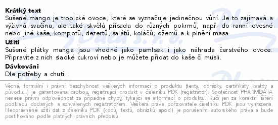 Sušené mango je tropické ovoce, které se vyznačuje jedinečnou vůní. Je to zajímavá a výživná svačina, ale také skvělá přísada do různých pokrmů, např. do ranní ovesné nebo jiné kaše, kompotů, dezertů, salátů, koláčů, džemů a k plnění masa.