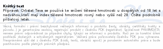 Přípravek Orlistat Teva se používá ke snížení tělesné hmotnosti u dospělých od 18 let s nadváhou,kteří mají index tělesné hmotnosti rovný nebo vyšší než 28. Čtěte pozorně příbalový leták.