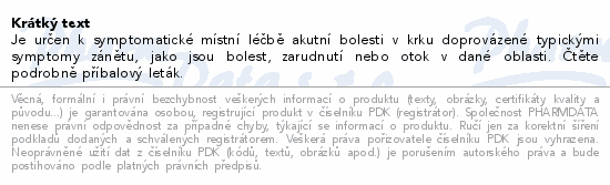 Je určen k symptomatické místní léčbě akutní bolesti v krku doprovázené typickými symptomy zánětu, jako jsou bolest, zarudnutí nebo otok v dané oblasti. Čtěte pozorně příbalový leták.