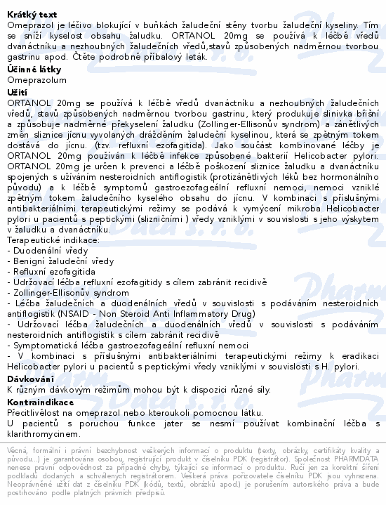 Omeprazol je léčivo blokující v buňkách žaludeční stěny tvorbu žaludeční kyseliny. Tím se sníží kyselost obsahu žaludku. ORTANOL 20mg se používá k léčbě vředů dvanáctníku a nezhoubných žaludečních vředů,stavů způsobených nadměrnou tvorbou gastrinu apod. Čtěte pozorně příbalový leták.
