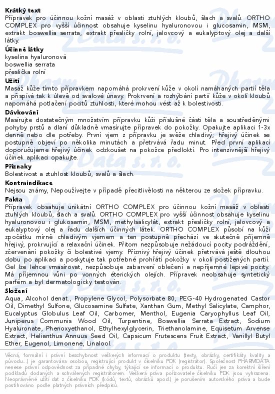 Přípravek pro účinnou kožní masáž v oblasti ztuhlých kloubů, šlach a svalů. ORTHO COMPLEX pro vyšší účinnost obsahuje kyselinu hyaluronovou i glucosamin, MSM, extrakt boswellia serrata, extrakt přesličky rolní, jalovcový a eukalyptový olej a další látky.