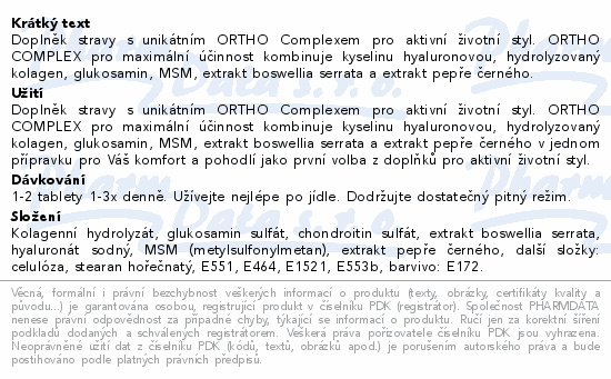 Doplněk stravy s unikátním ORTHO Complexem pro aktivní životní styl. ORTHO COMPLEX pro maximální účinnost kombinuje kyselinu hyaluronovou, hydrolyzovaný kolagen, glukosamin, MSM, extrakt boswellia serrata a extrakt pepře černého.