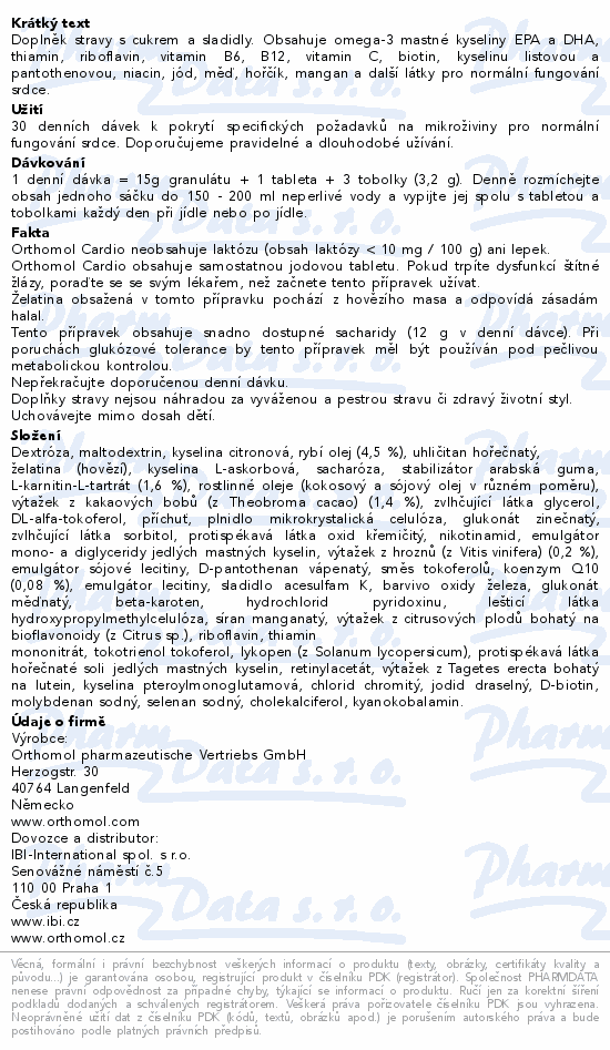 Doplněk stravy s cukrem a sladidly. Obsahuje omega-3 mastné kyseliny EPA a DHA, thiamin, riboflavin, vitamin B6, B12, vitamin C, biotin, kyselinu listovou a pantothenovou, niacin, jód, měď, hořčík, mangan a další látky pro normální fungování srdce.