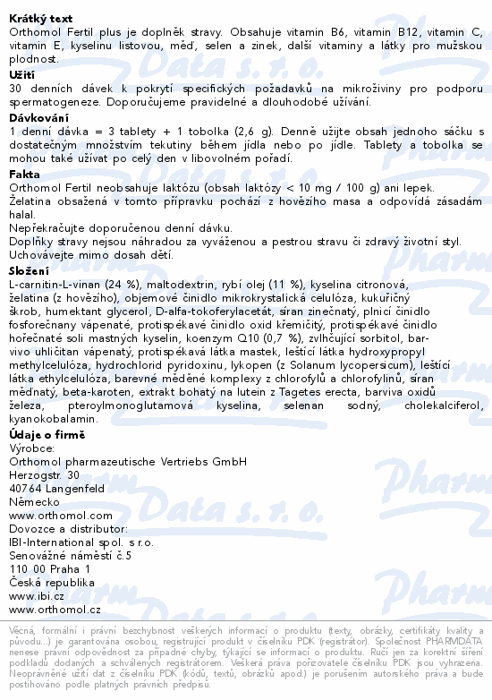 Orthomol Fertil plus je doplněk stravy. Obsahuje vitamin B6, vitamin B12, vitamin C, vitamin E, kyselinu listovou, měď, selen a zinek, další vitaminy a látky pro mužskou plodnost.