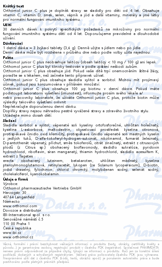 Orthomol junior C plus je doplněk stravy se sladidly pro děti od 4 let. Obsahuje vitamin C, vitamin D, zinek, selen, vápník a jód a další vitaminy, minerály a jiné látky pro normální fungování imunitního systému.