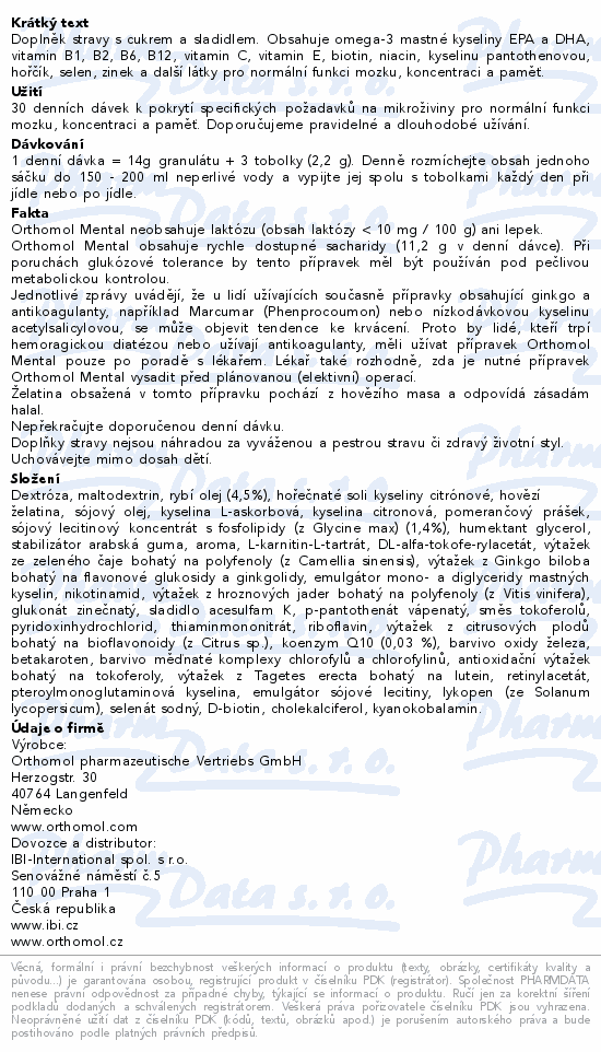 Orthomol Mental je doplněk výživy s obsahem důležitých mikroživin pro mozek, koncentraci a paměť. Obsahuje cukry a sladidla, neobsahuje laktozu ani lepek.